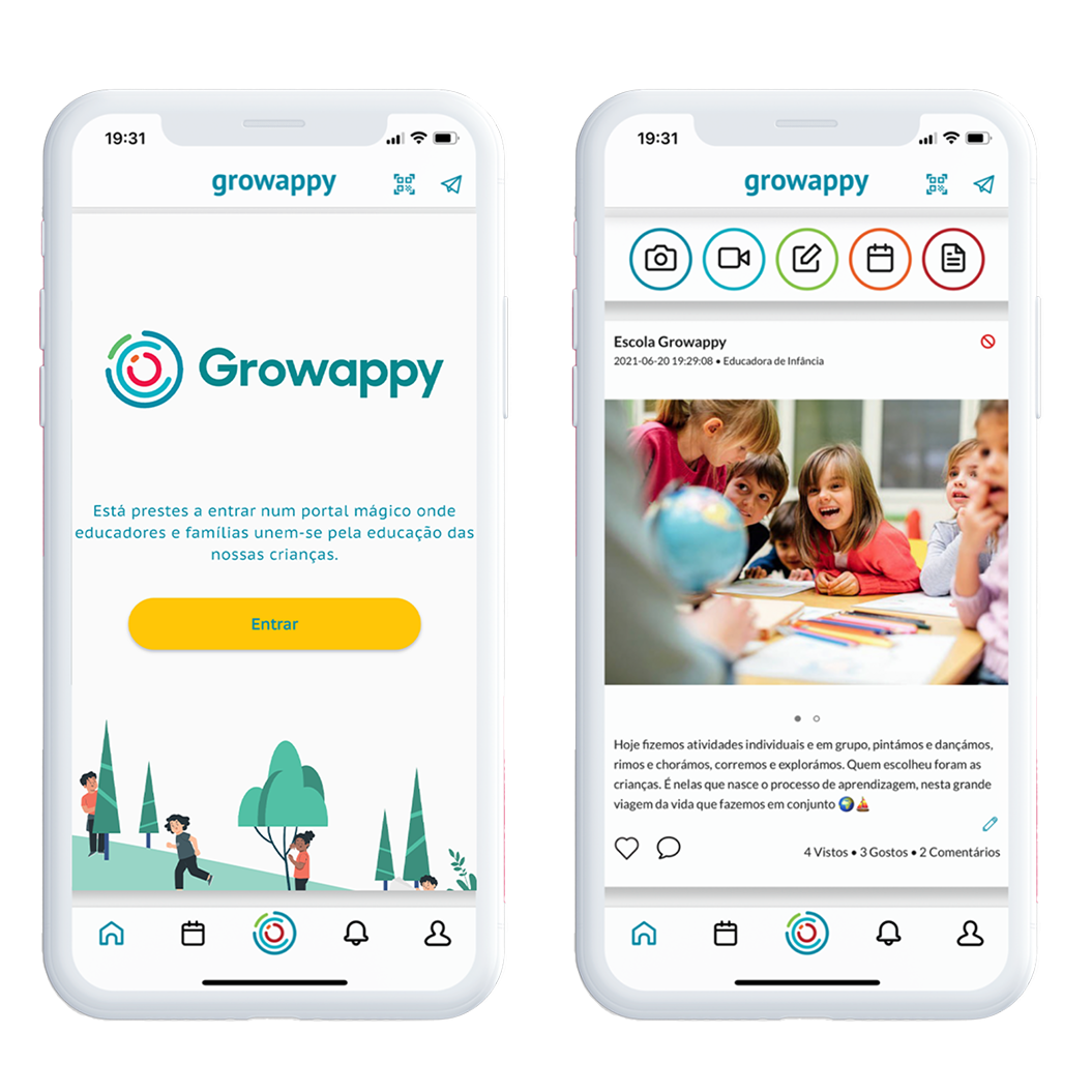 Utilizamos a aplicação Growappy para manter os pais sempre informados sobre o dia a dia dos seus filhos. Refeições, sestas, fotografias, atividades e recados importantes — tudo partilhado com segurança e simplicidade, no seu telemóvel.